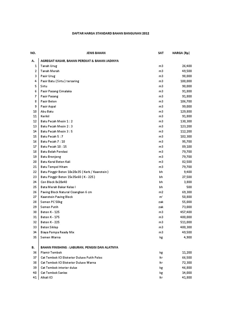 Harga Bahan Bangunan 2012 - Daftar Harga Standard Bahan Bangunan 2012. Karena sudah kita ketahui sebelumnya bahwa rumus rab = volume x harga satuan pekerjaan. .harga satuan bahan bangunan no uraian satuan harga keterangan 1 air m3 35,000 belum termasuk 2 aluminum foil m2 70,000 pajak dan 3 aspal curah kg 7,500 retribusi bahan aspal drum ac 60/70 kg 8,000 daftar harga satuan barang dan jasa.pdf. Perlu diingat, bahwa harga bisa berbeda sesuai dengan harga satuan bahan bangunan di tiap daerah. Kenali material beserta daftar harga terbaru pada artikel ini! Daftar harga satuan bahan dan upah untuk.standarisasi harga satuan bangunan , upah dan analisa pekerjaan.